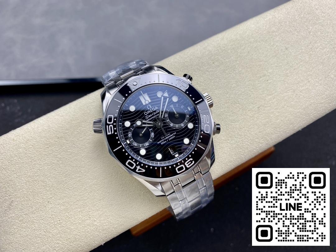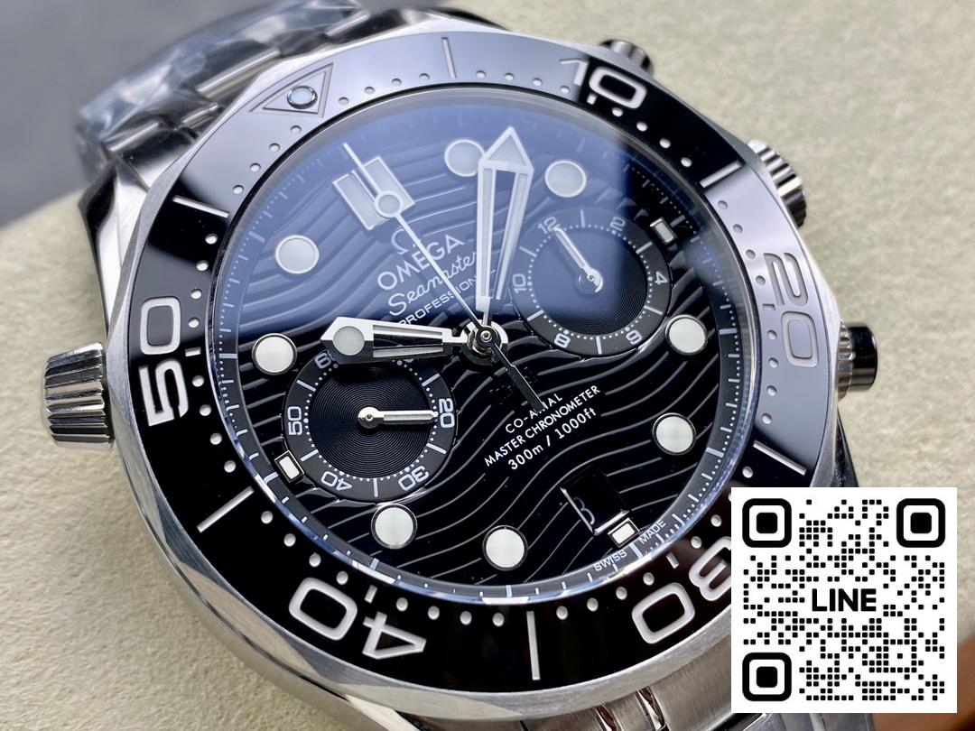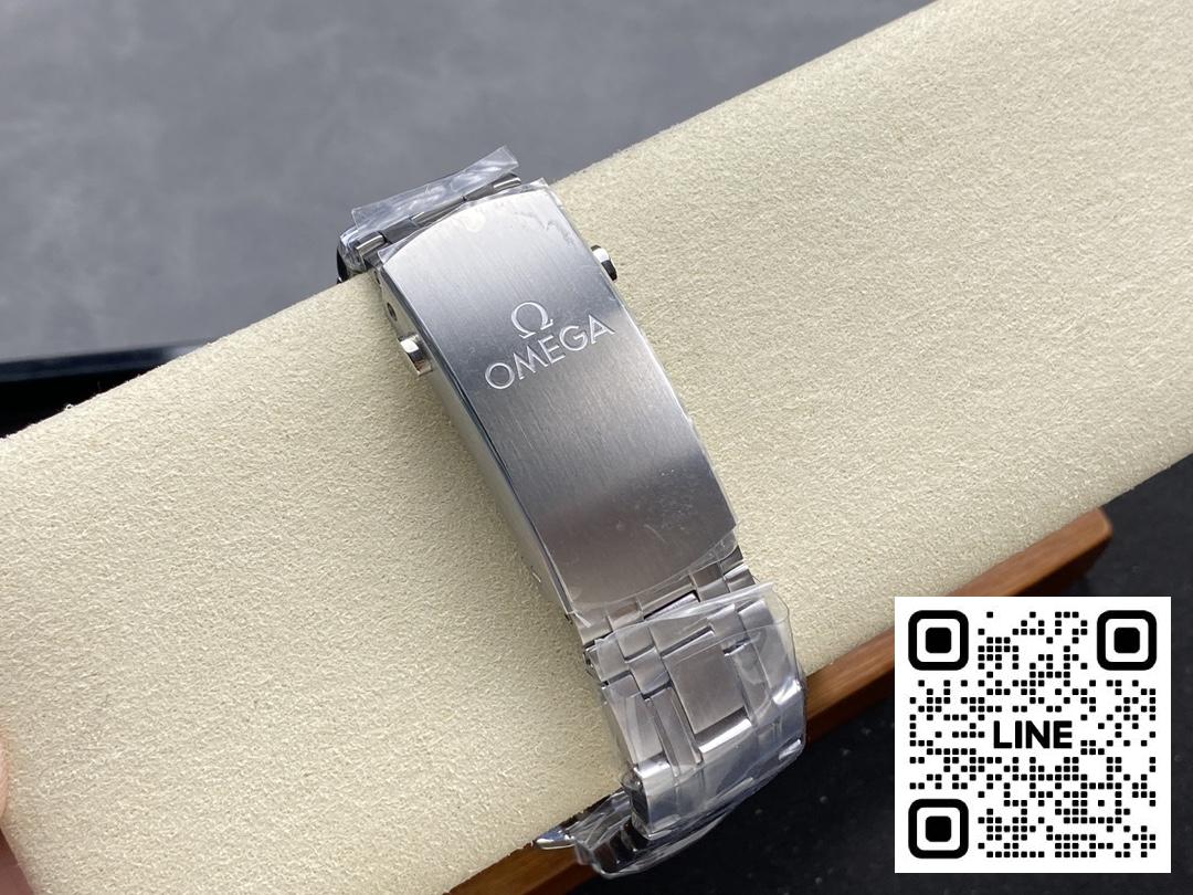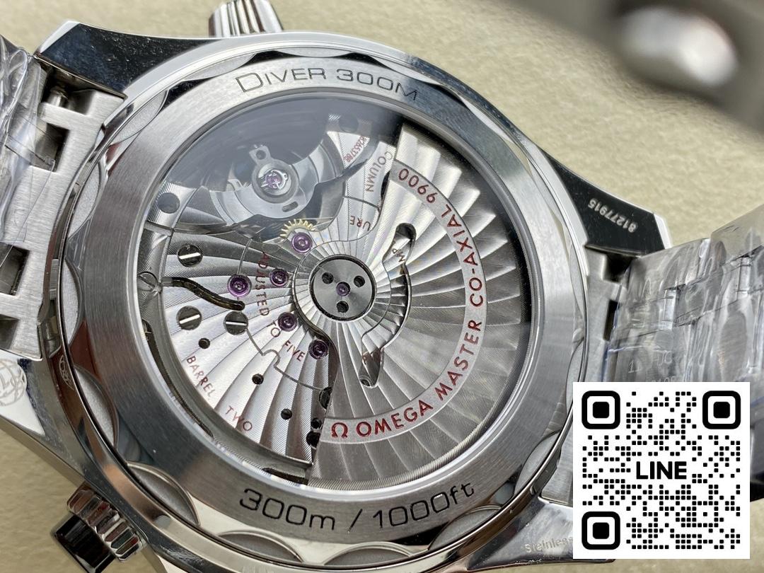 ブラックラバー製のストラップが付属。オメガ キャリバー 9900が搭載され、波模様で縁取られたサファイアクリスタルガラスのケースバックから眺めることができます。