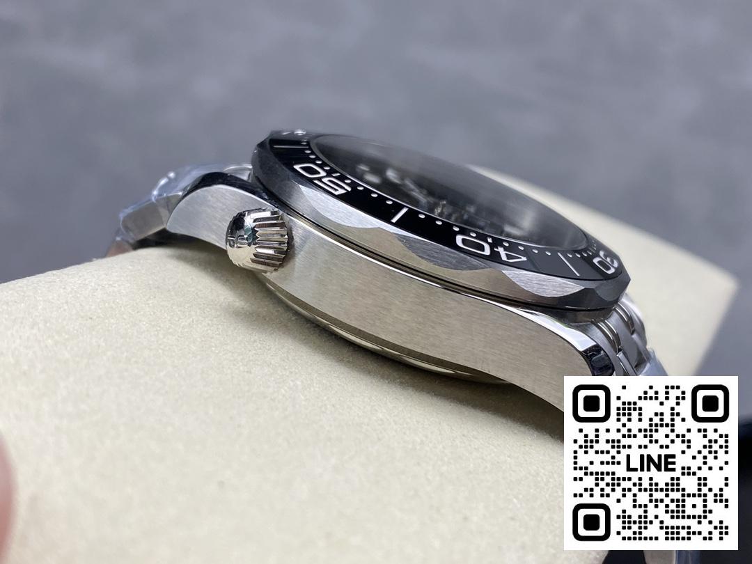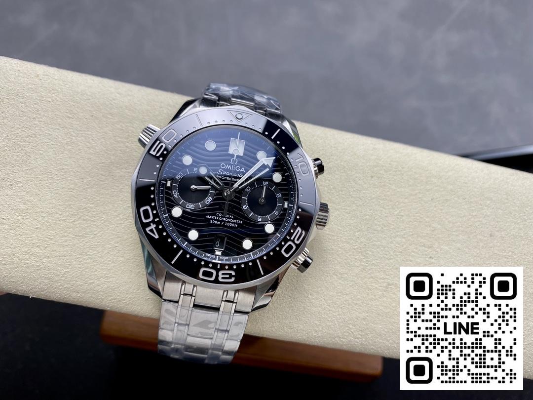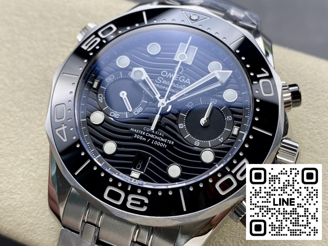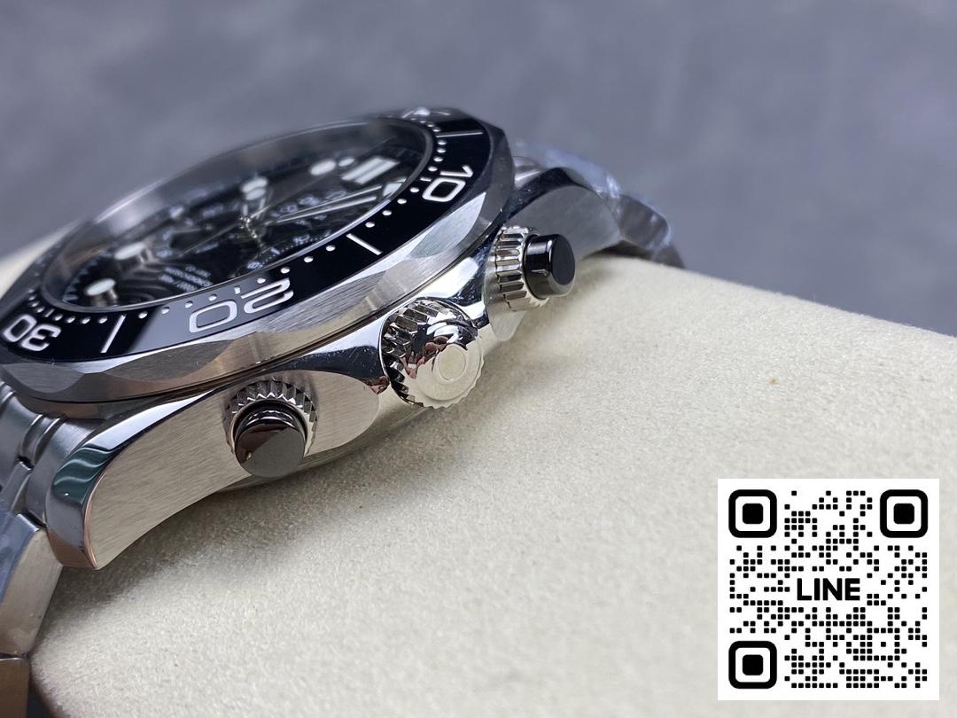 ブラックラバー製のストラップが付属。オメガ キャリバー 9900が搭載され、波模様で縁取られたサファイアクリスタルガラスのケースバックから眺めることができます。
