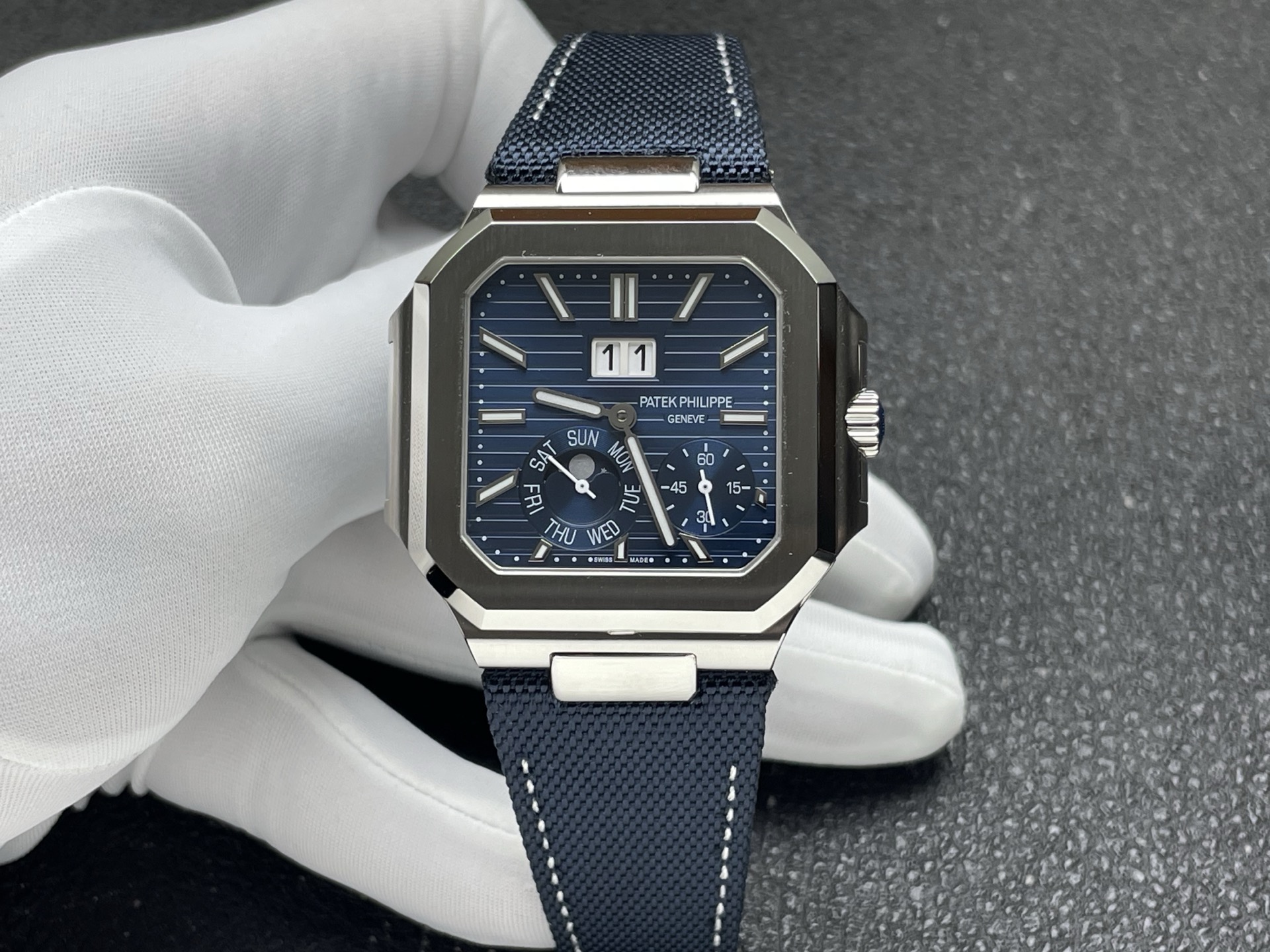 パテック・フィリップは、大胆さと優雅さが独創的に融合した「キュビタス(2024)」コレクションの誕生を記念し、日付表示、曜日表示、ムーンフェイズ表示を備えた複雑構造モデル5822を発表する。ステンレススチール製ケースのオリジナルデザインは、12時位置に日付表示を配し、4時と5時位置の間に秒針のサブダイヤルを配置し、6時と8時位置の間に曜日表示、ムーンフェイズ表示を揃っている。鏡面仕上げと縦サテン仕上げのコントラストによって一層引き立てられている。