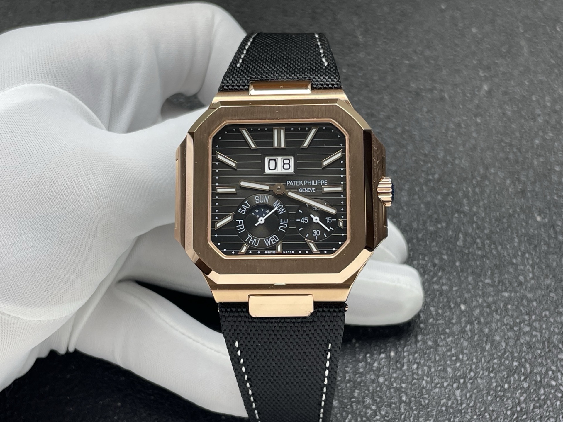 パテック・フィリップは、大胆さと優雅さが独創的に融合した「キュビタス(2024)」コレクションの誕生を記念し、日付表示、曜日表示、ムーンフェイズ表示を備えた複雑構造モデル5822を発表する。ステンレススチール製ケースのオリジナルデザインは、12時位置に日付表示を配し、4時と5時位置の間に秒針のサブダイヤルを配置し、6時と8時位置の間に曜日表示、ムーンフェイズ表示を揃っている。鏡面仕上げと縦サテン仕上げのコントラストによって一層引き立てられている。