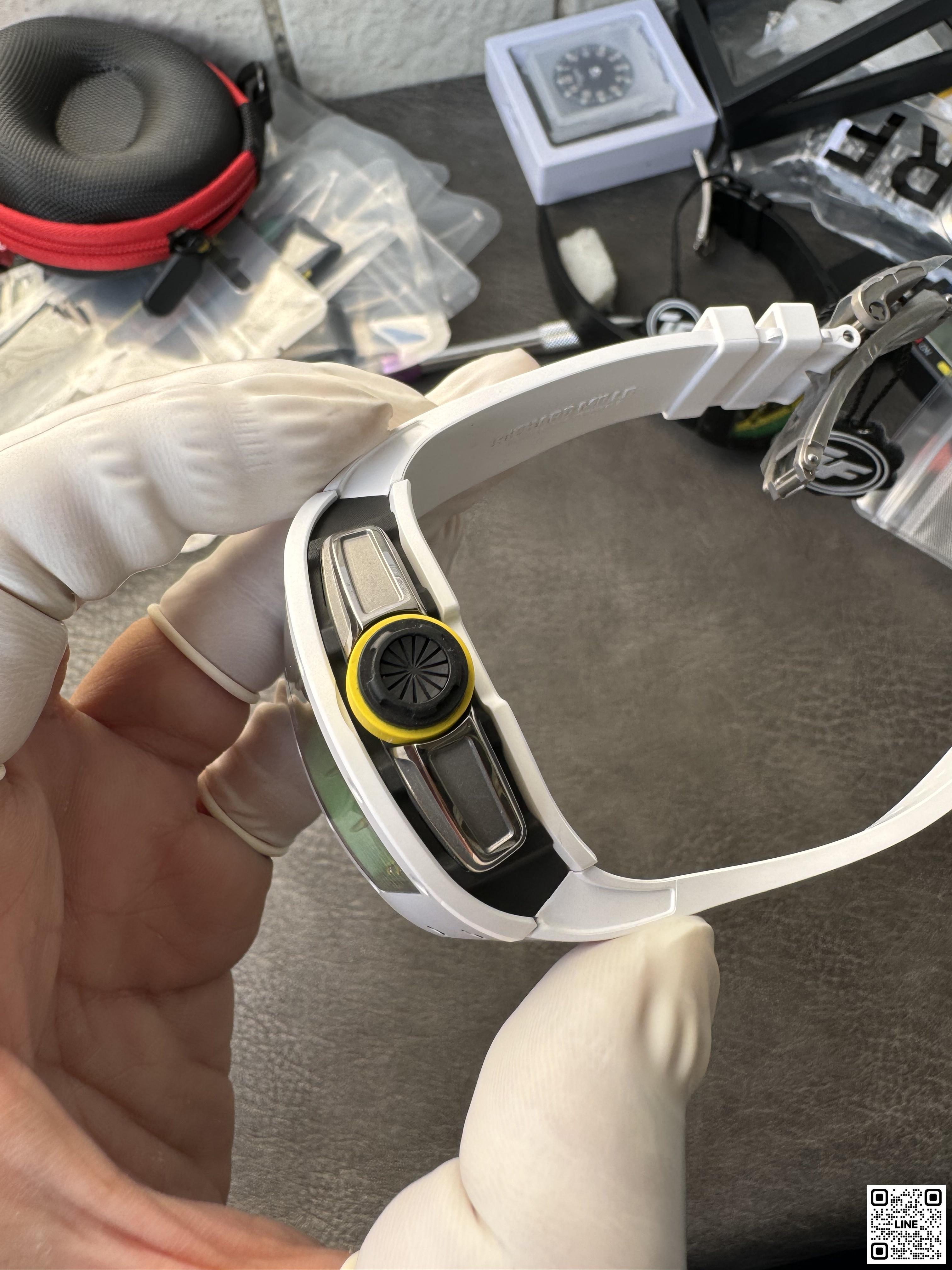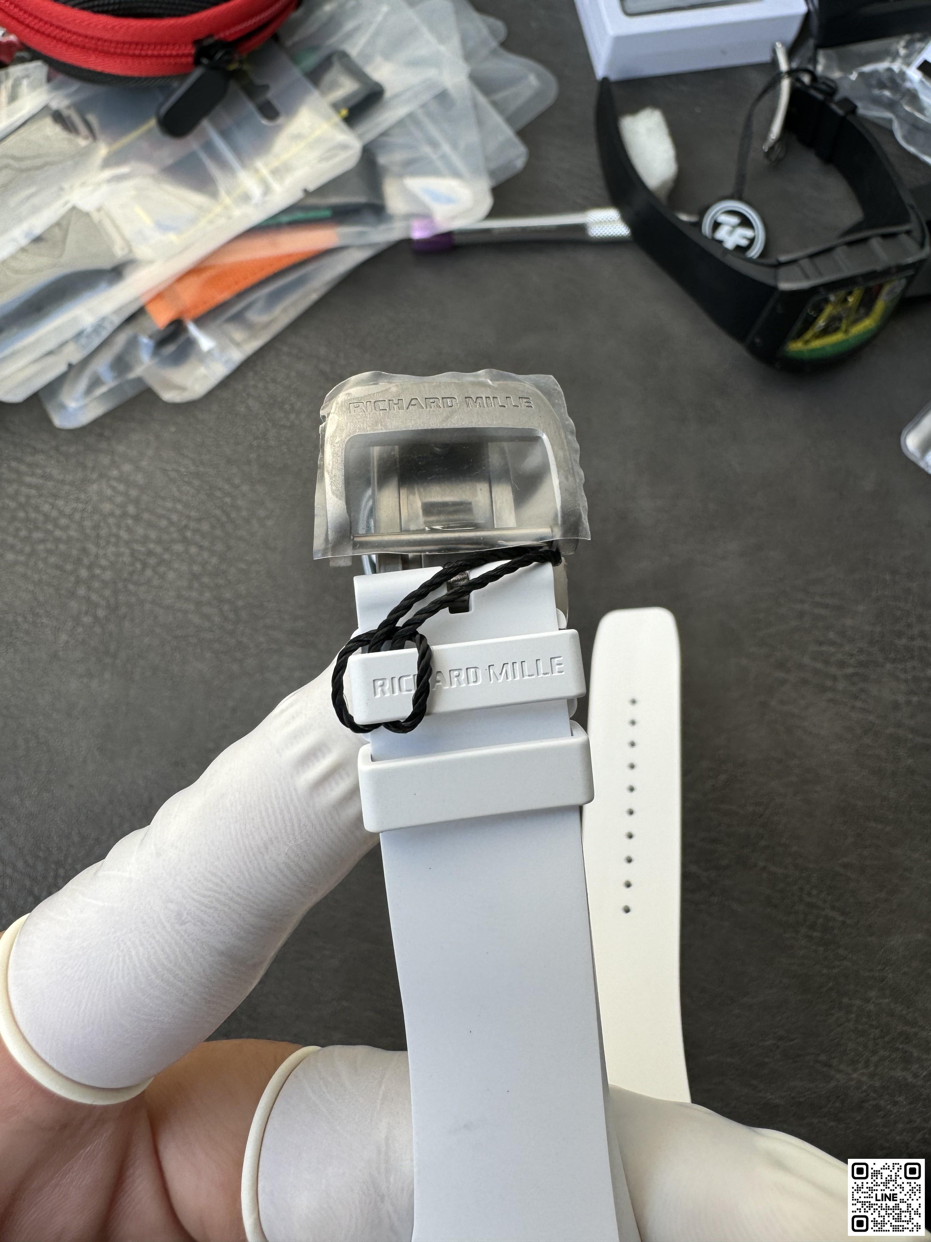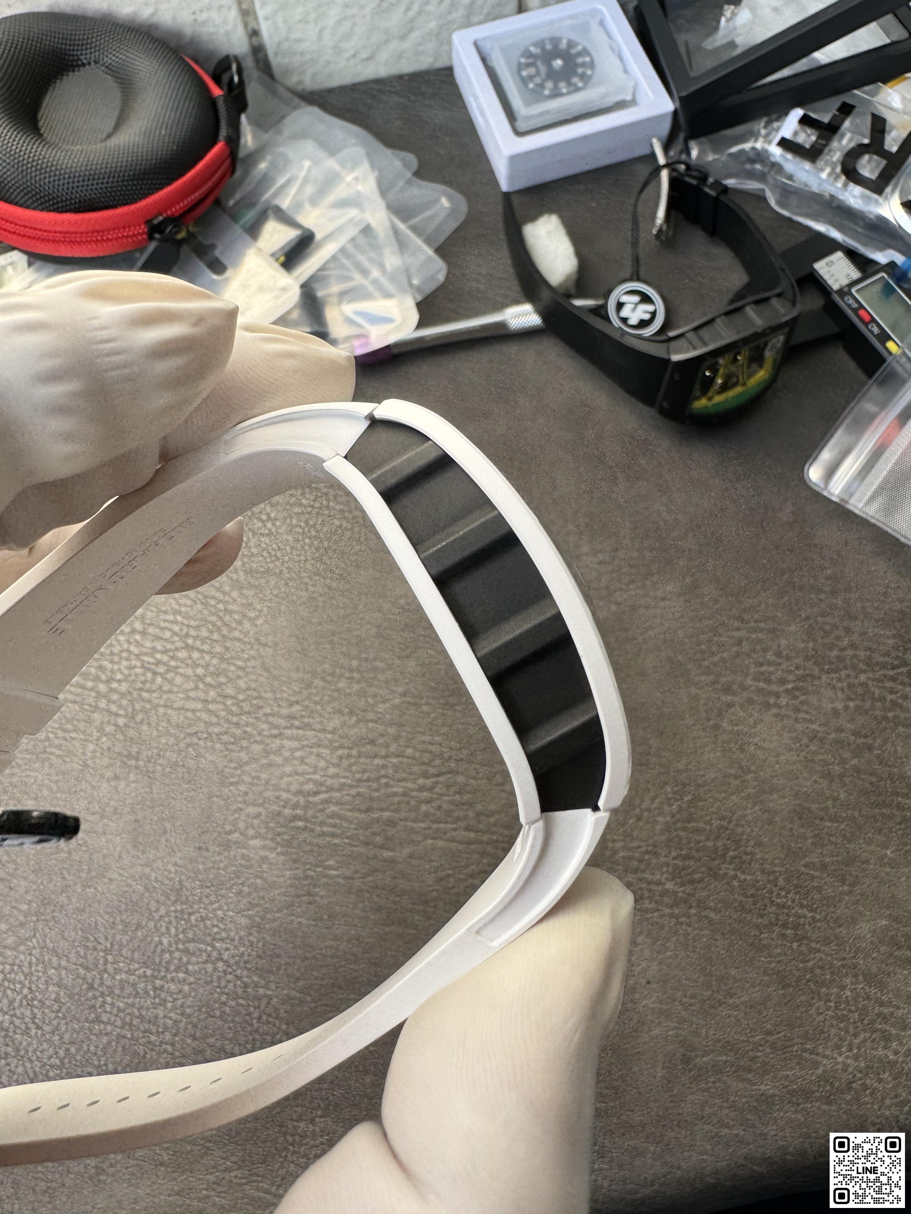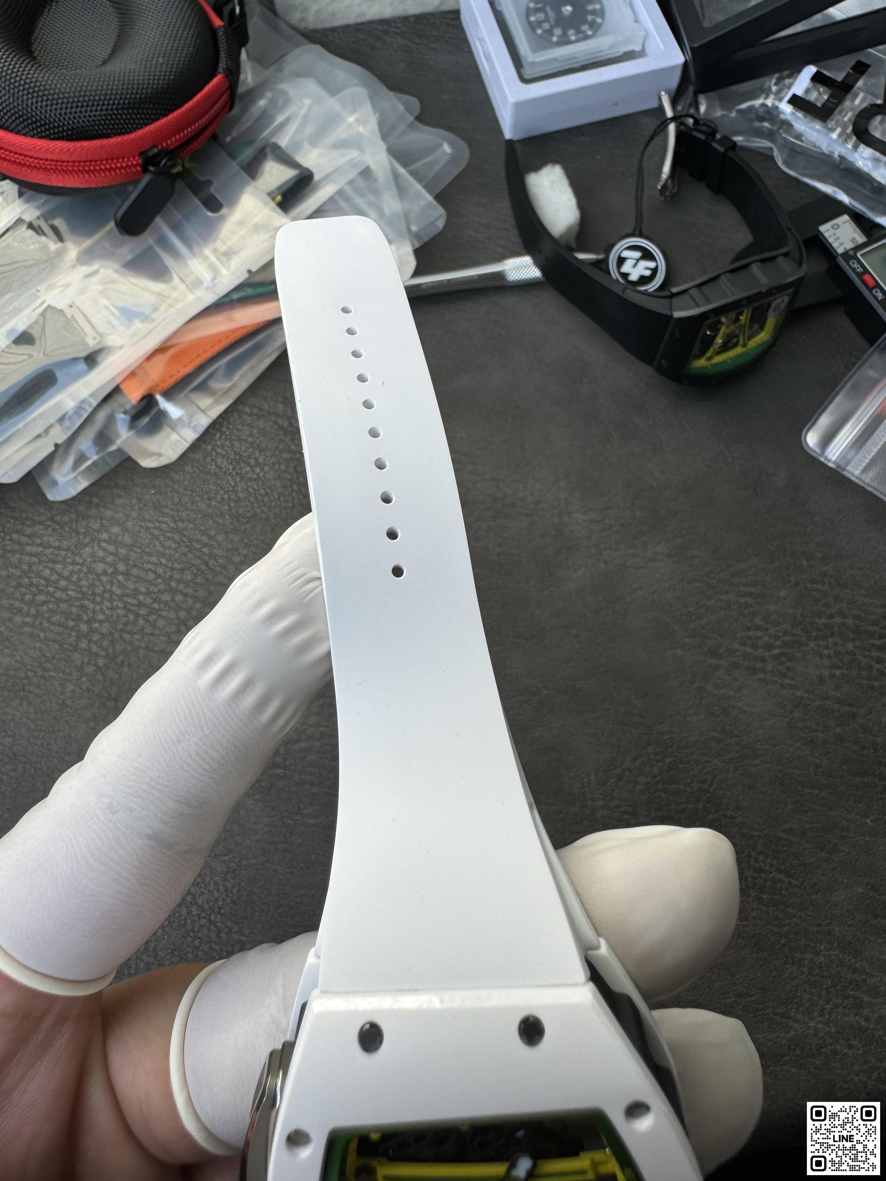 RM 61-01のベゼルとケースバックにはTPTカーボンを採用。強靭な素材は低密度で、極めて高い耐傷性と極めて低い熱伝導性を兼ね備えています。ブラスト加工と手作業のポリッシュ仕上げの面取りが施され、完璧に仕上げられています。軽く弾力性に優れたカーボンNTPT®製のミドルケースとも美しいコンビネーションを実現。2時位置と5時位置の間が引き延ばされたフォルムになっているため、リューズがスプリンターの手首に触れて擦れることはありません。