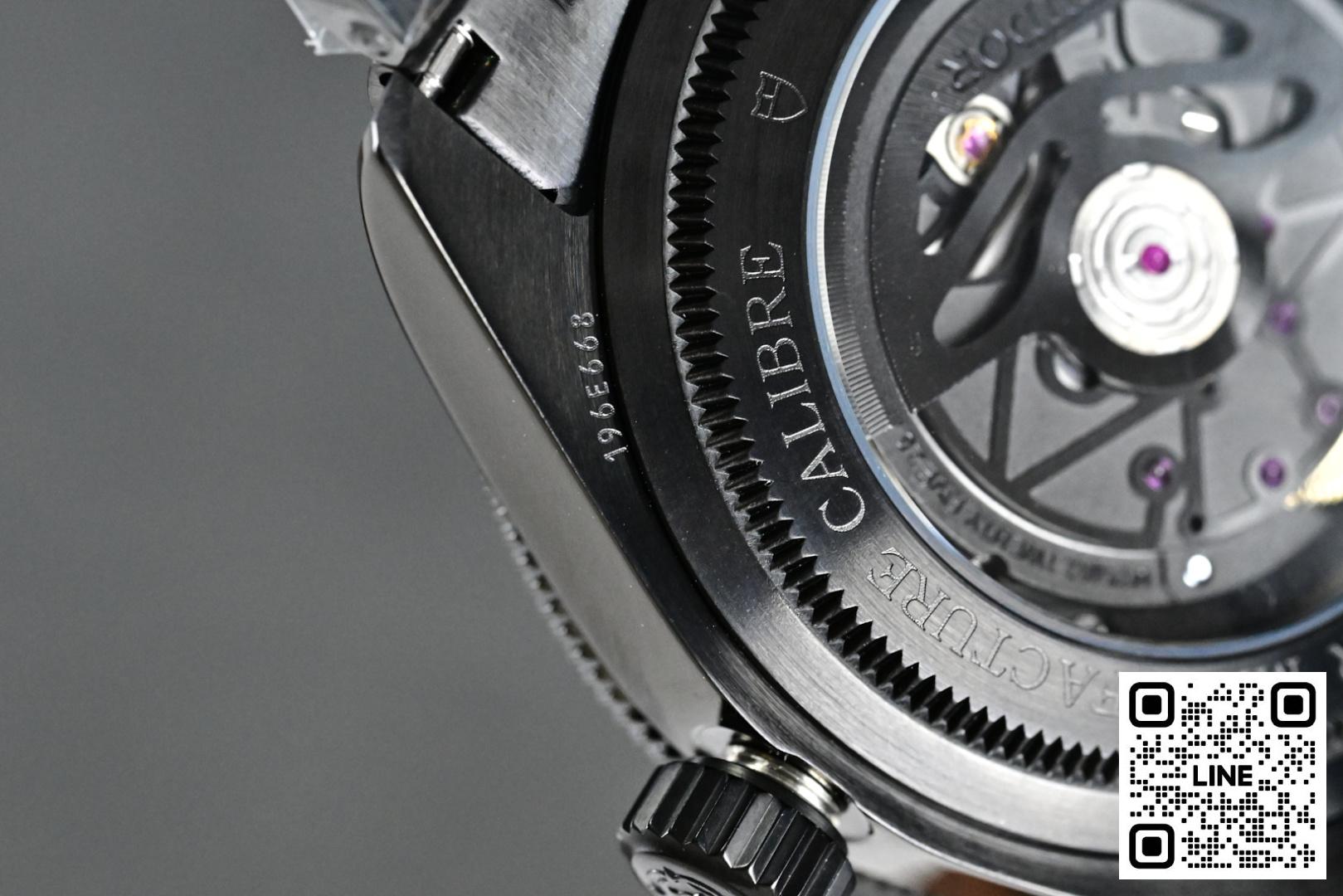 ベゼル:ブラックPVDコーティングのスチール製逆回転防止ベゼル、60分目盛り付きブラックセラミック製ディスク、サンレイサテン仕上げにエングレービングのマーカーと数字