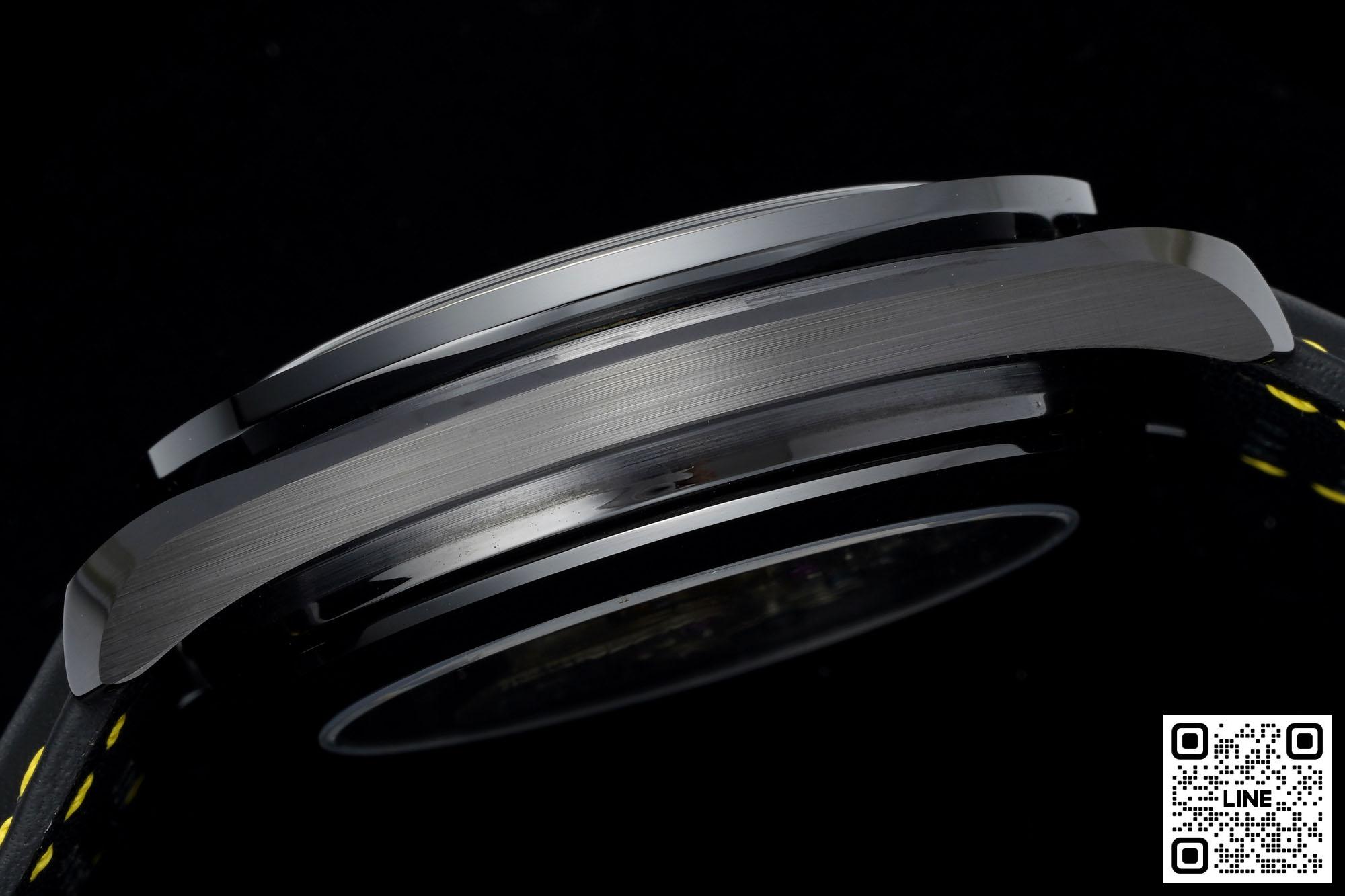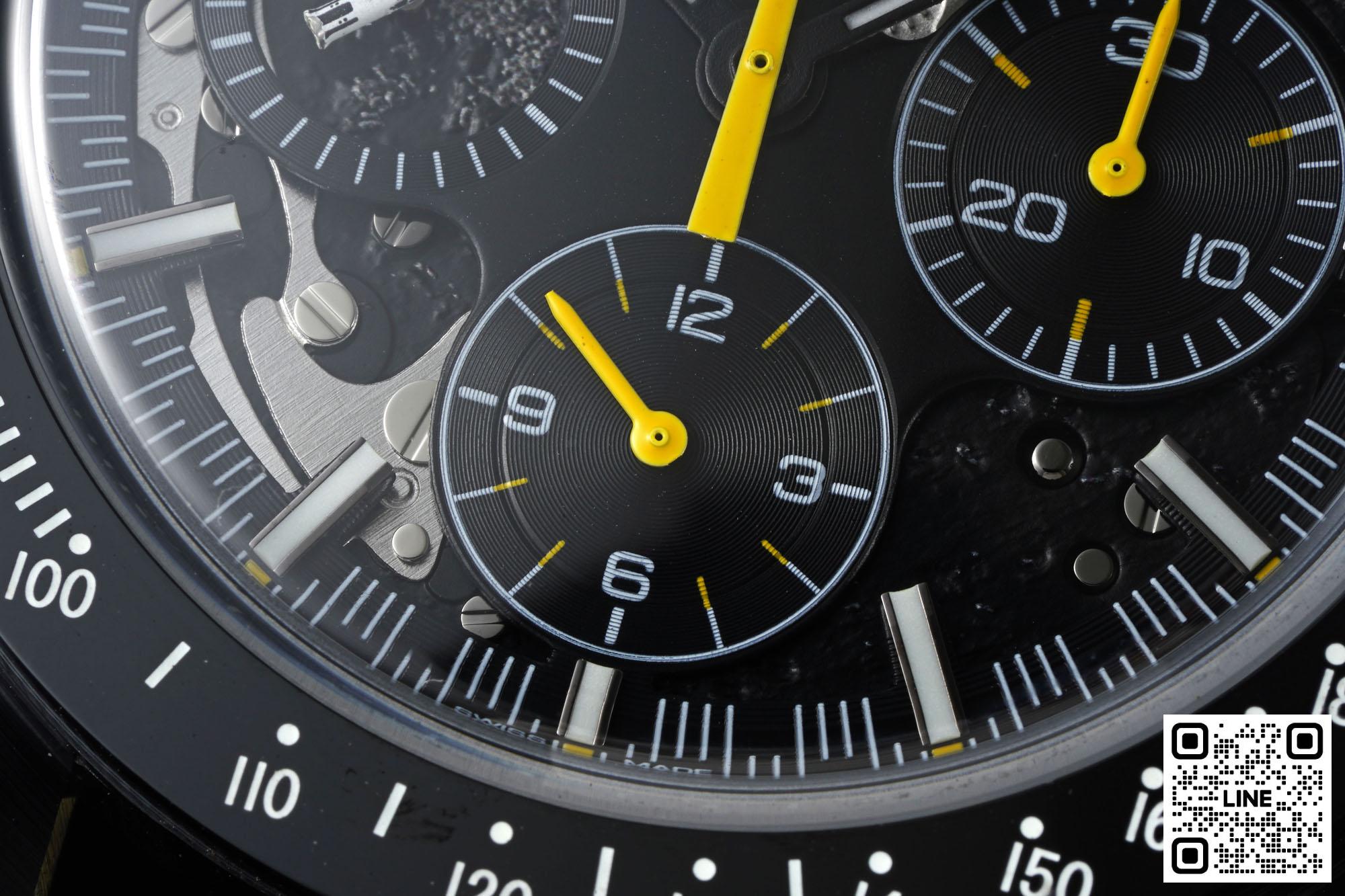 ウォッチ全体がブラックセラミック製で、ニス加工を施したイエローのクロノグラフ秒針に、イエローラバーを内部に敷いたパンチング加工のブラックラバーストラップが付いています。またベゼルには、レーザーでエングレービングをしてホワイトエナメルを充填したタキメータースケールが備えられています。スモールセコンドのサブダイアルには、サターンV ロケットを象ったグレード5チタン製の針が。回転レーザー加工で作られた3Dのシェイプに、ホワイトのニス、レーザー加工による装飾とブラックのカラーリングがされたデザインです。