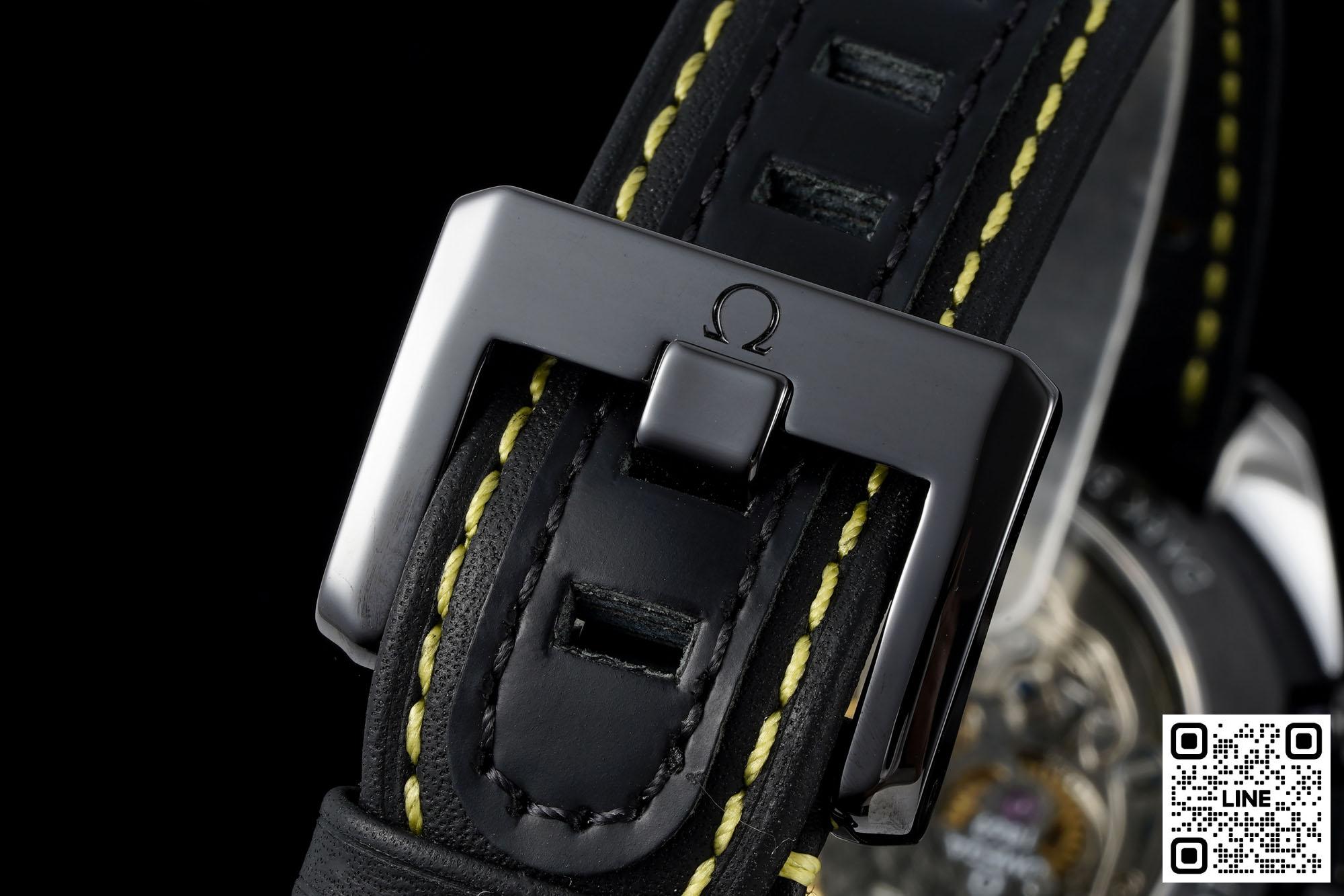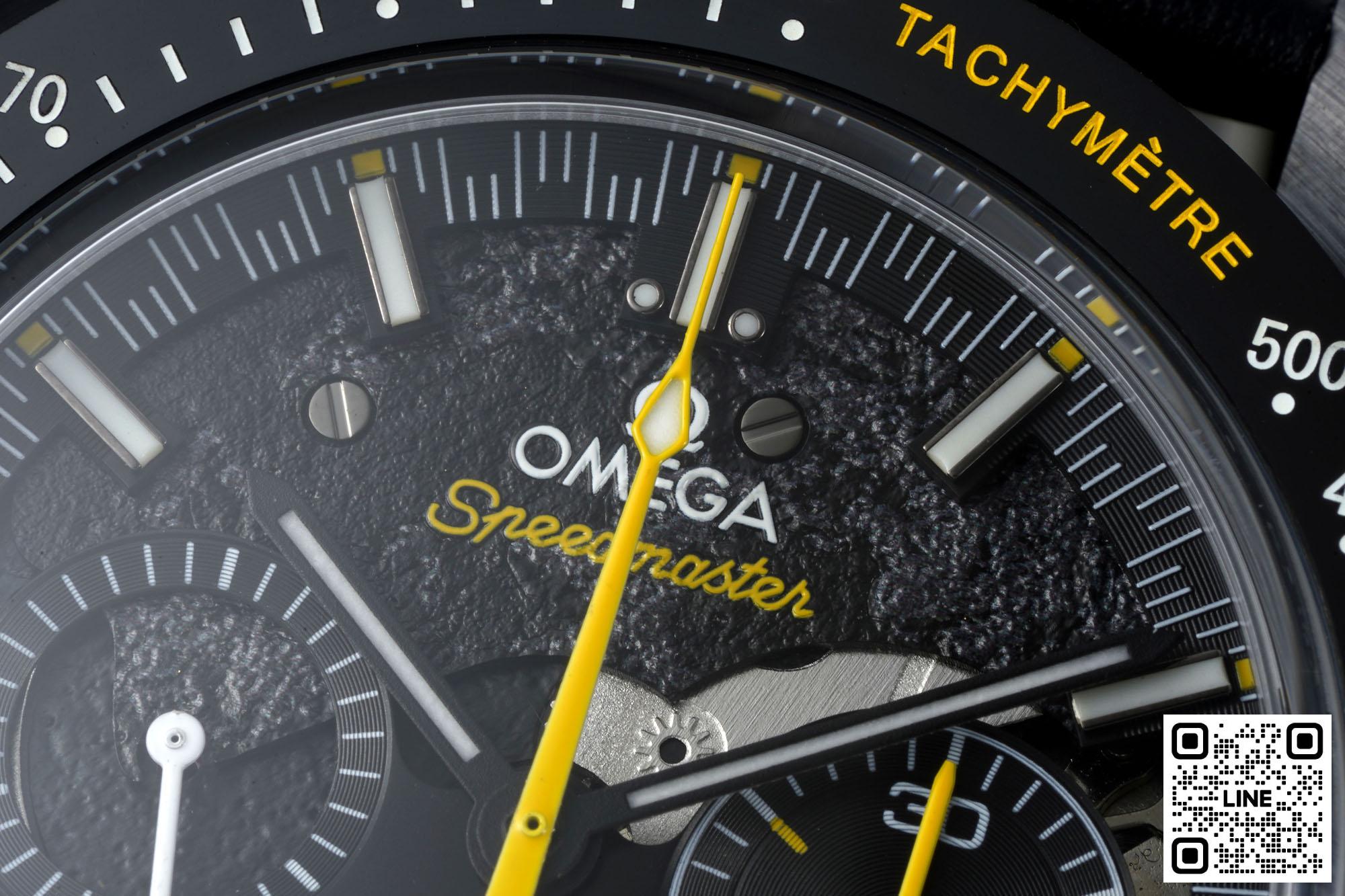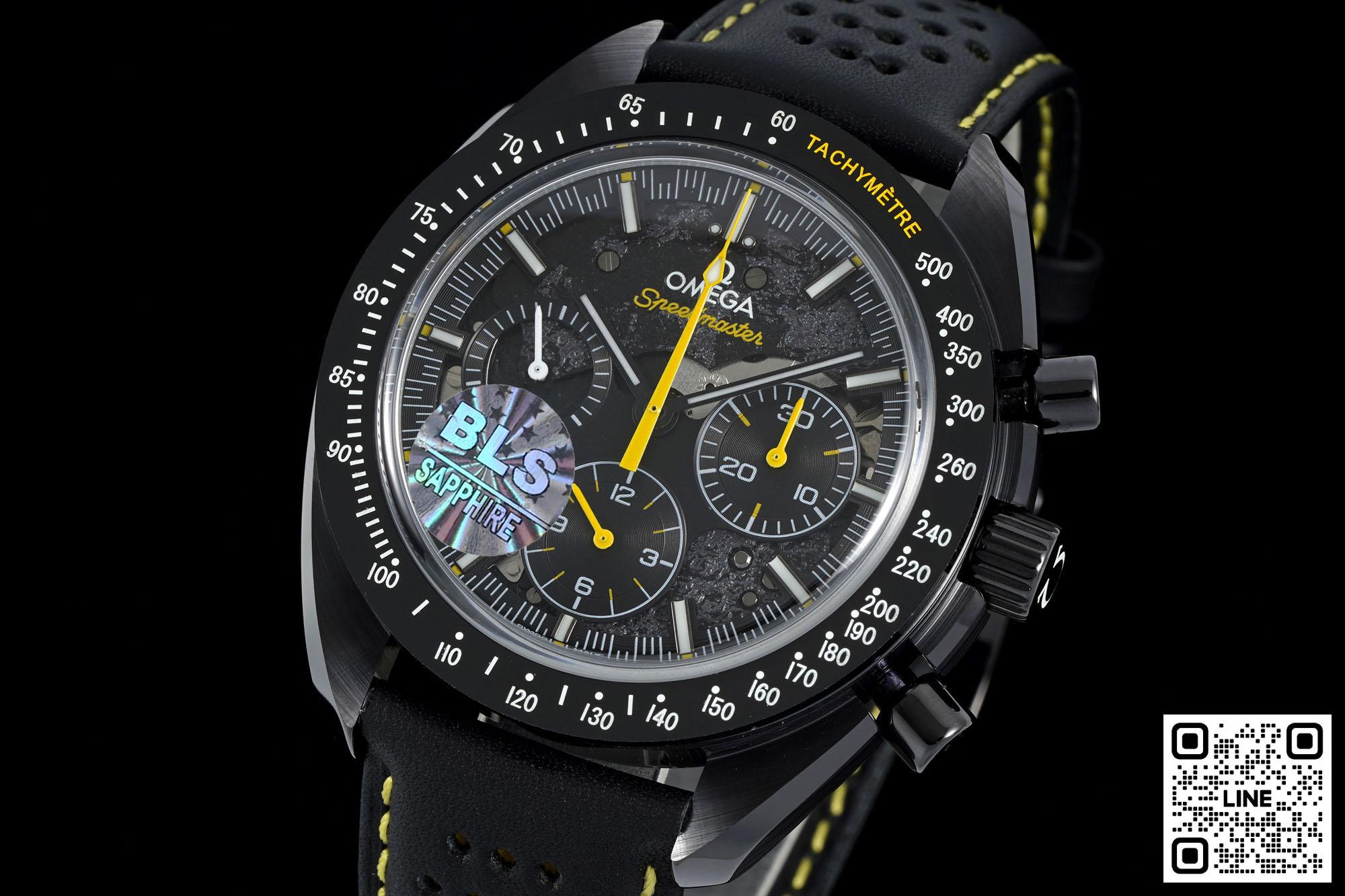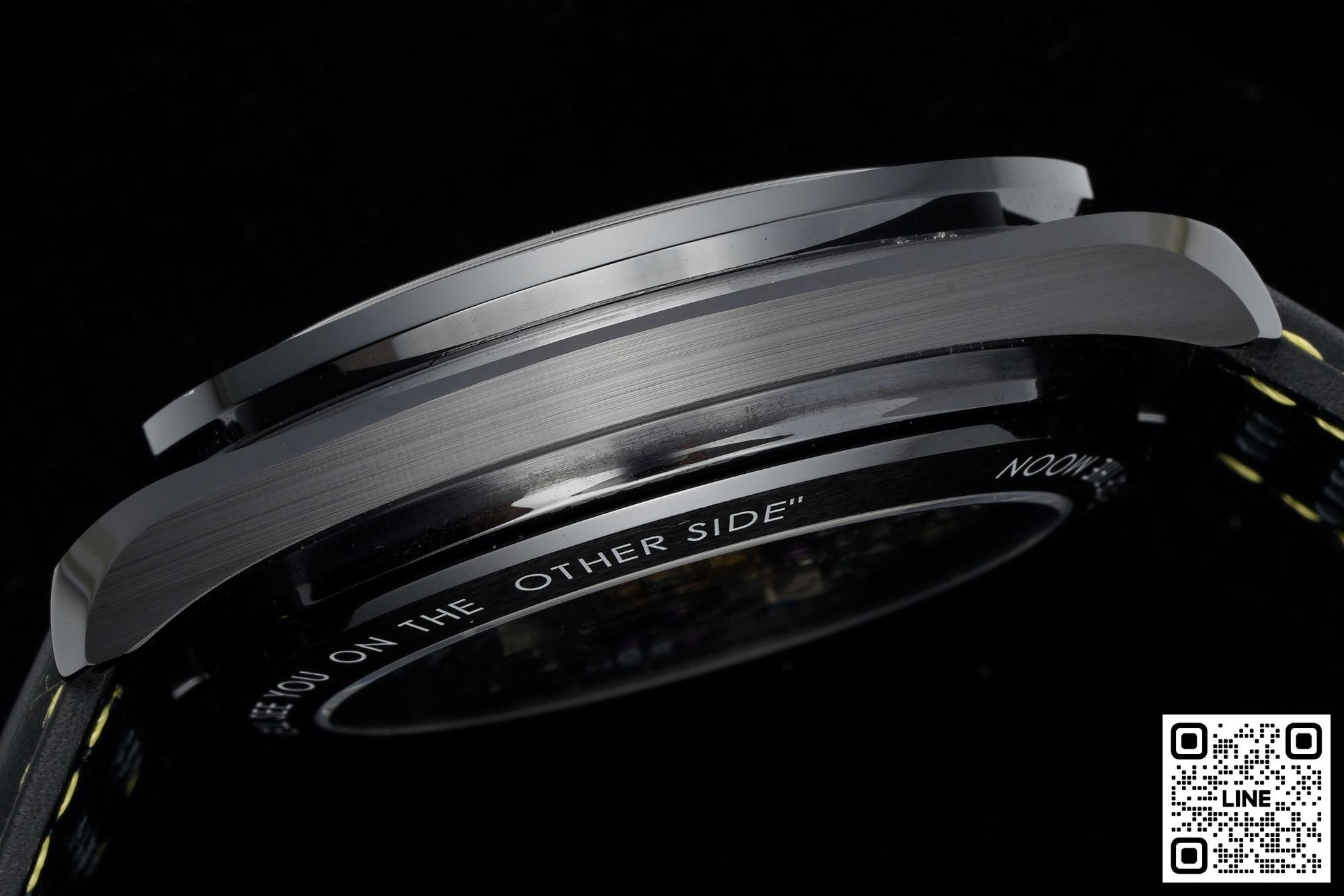 ウォッチ全体がブラックセラミック製で、ニス加工を施したイエローのクロノグラフ秒針に、イエローラバーを内部に敷いたパンチング加工のブラックラバーストラップが付いています。またベゼルには、レーザーでエングレービングをしてホワイトエナメルを充填したタキメータースケールが備えられています。スモールセコンドのサブダイアルには、サターンV ロケットを象ったグレード5チタン製の針が。回転レーザー加工で作られた3Dのシェイプに、ホワイトのニス、レーザー加工による装飾とブラックのカラーリングがされたデザインです。