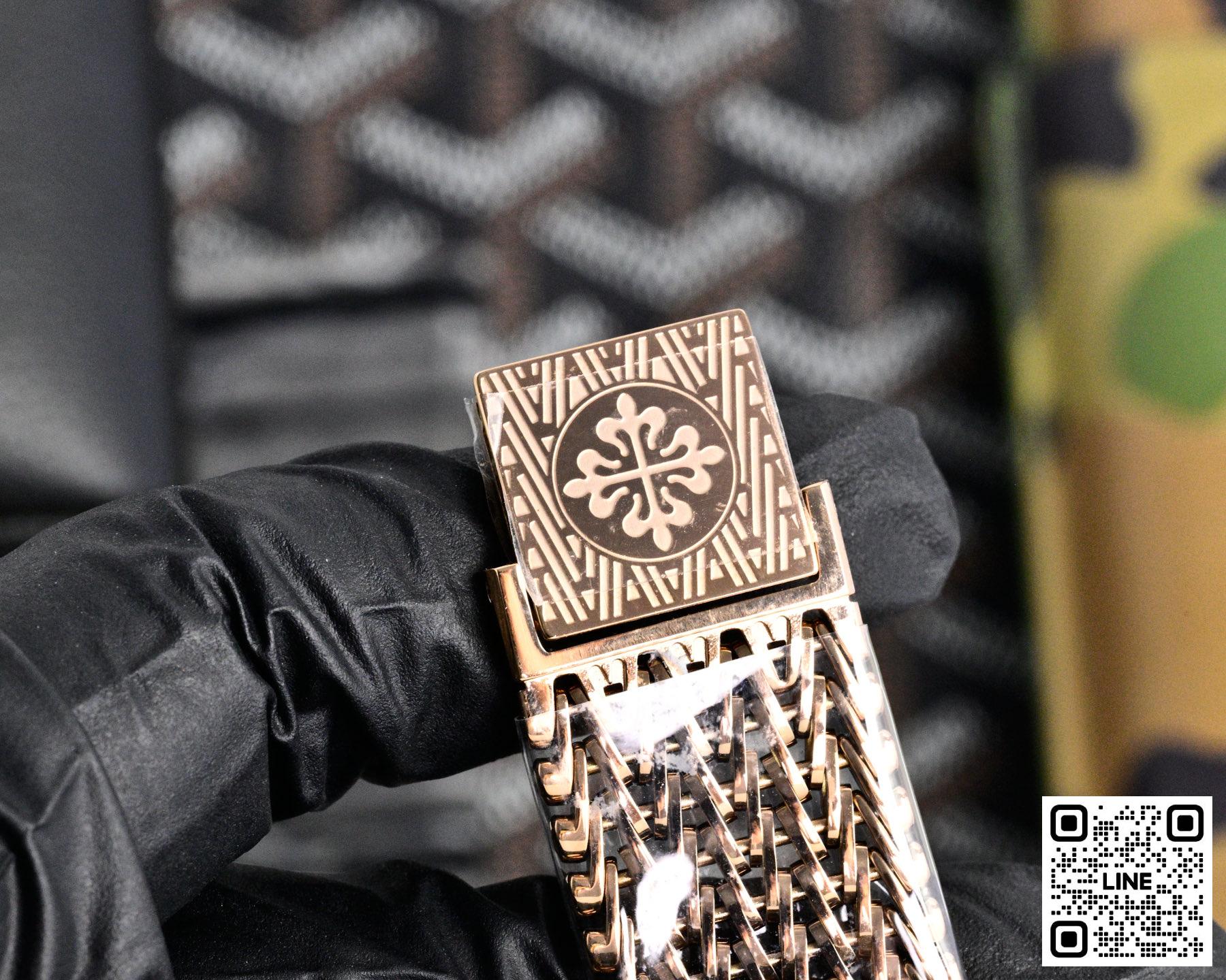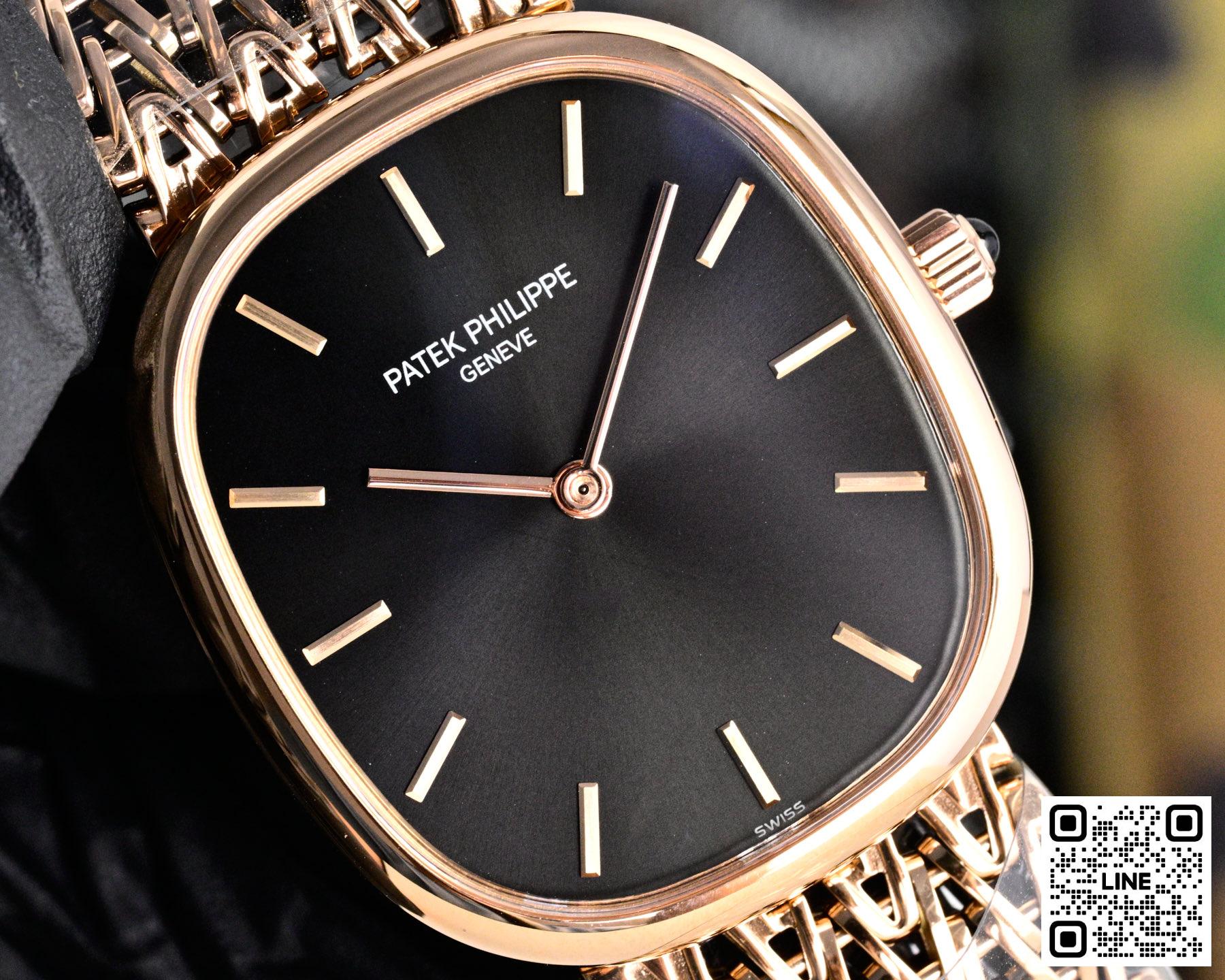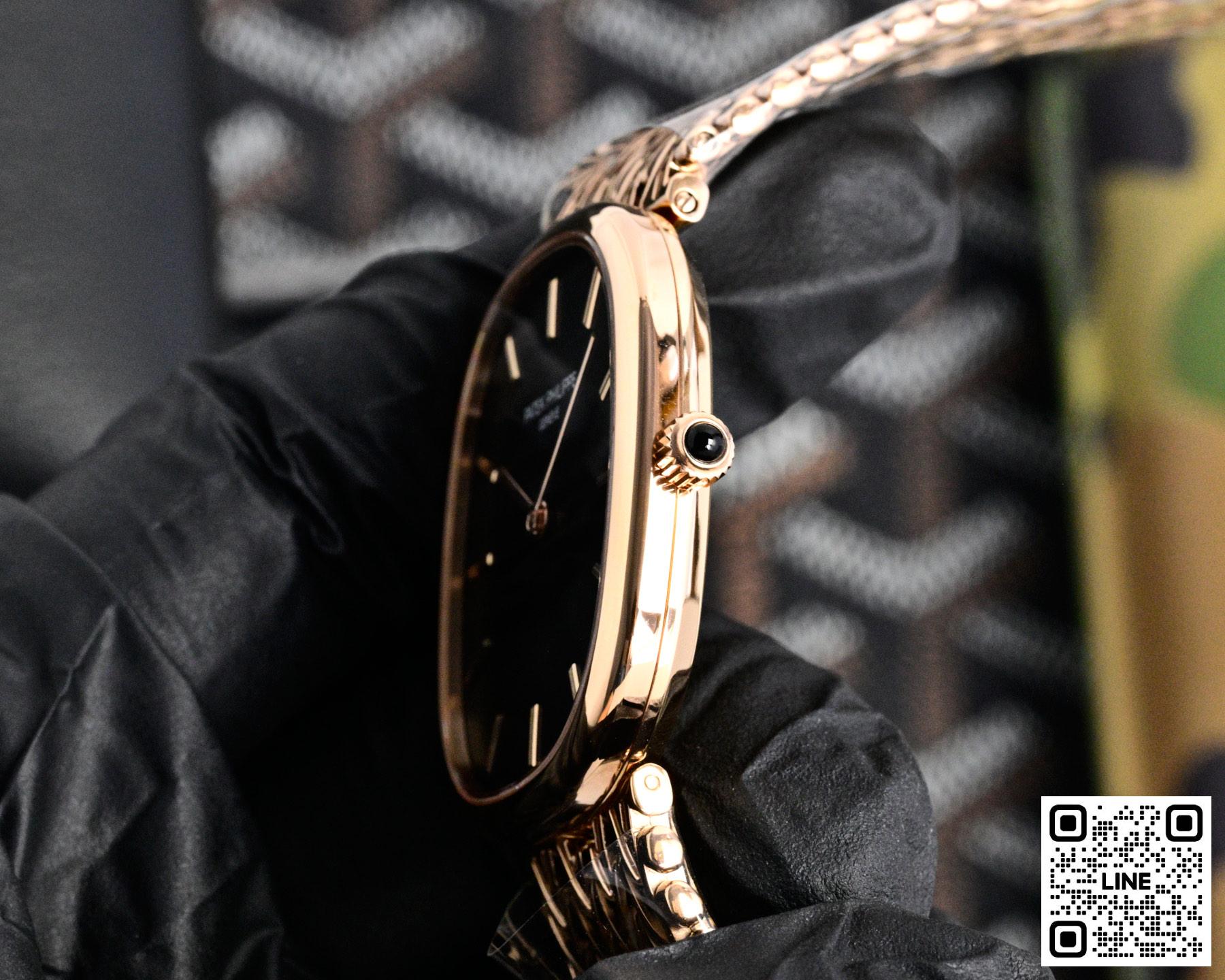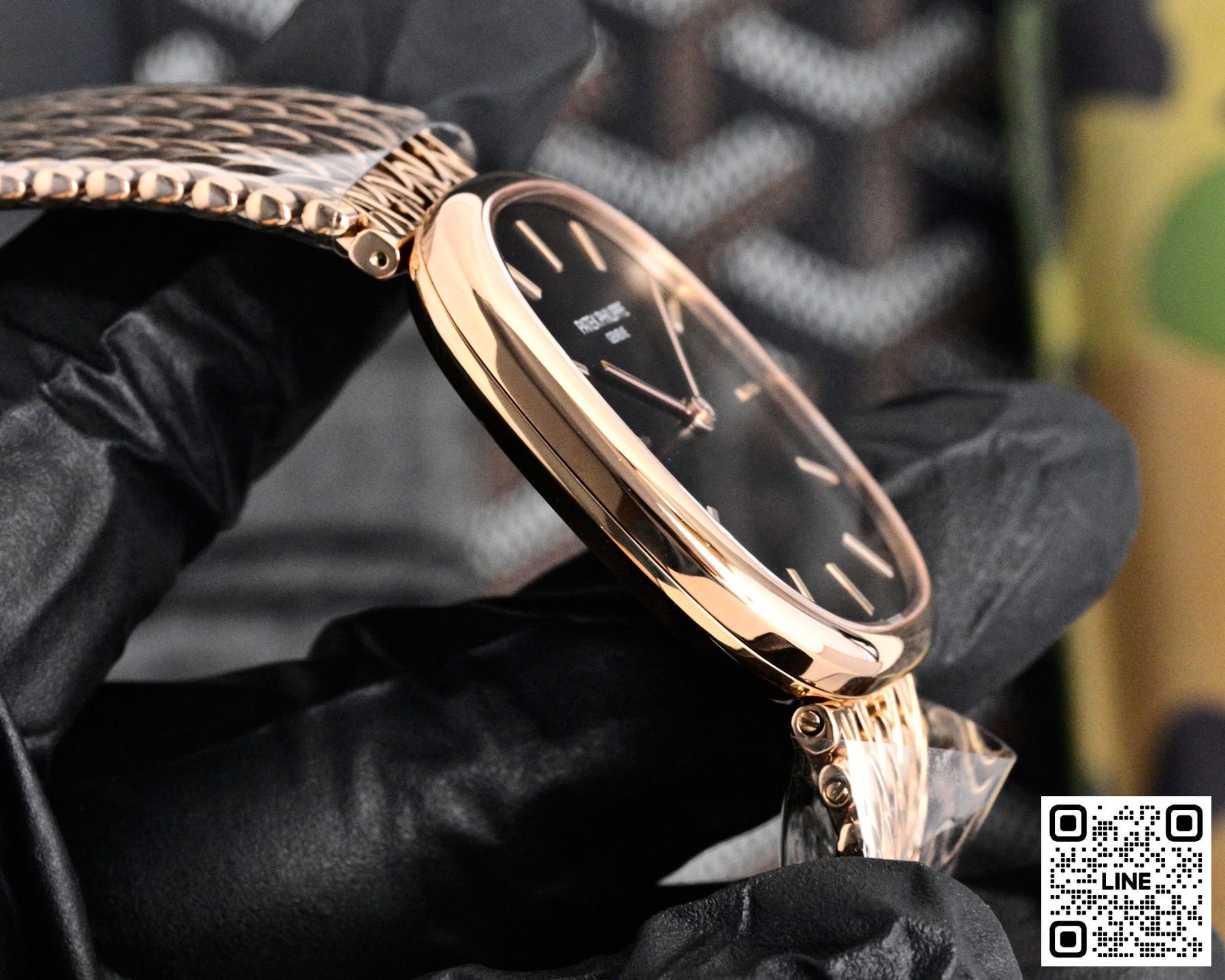 パテック フィリップ 5738は、ブランドを代表するトノー型ウォッチの傑作です。ローズゴールドが放つ温かな光沢と、深みのあるブラックダイヤルに配されたバーインデックスや細身の針が、極めてミニマルでエレガントな美学を体現しています。なめらかなケースラインが手首に心地よくフィットし、優れた装着感を約束します。