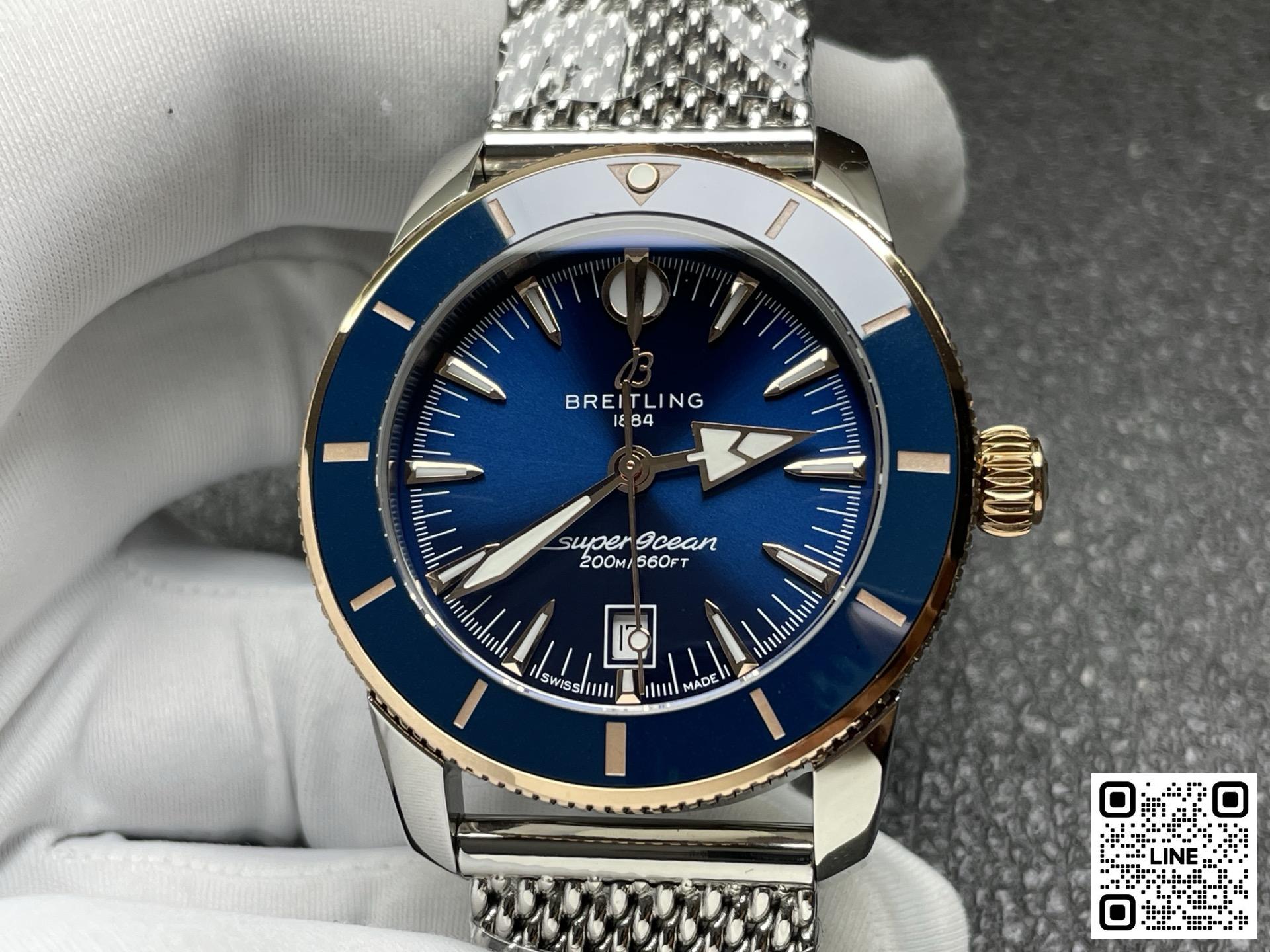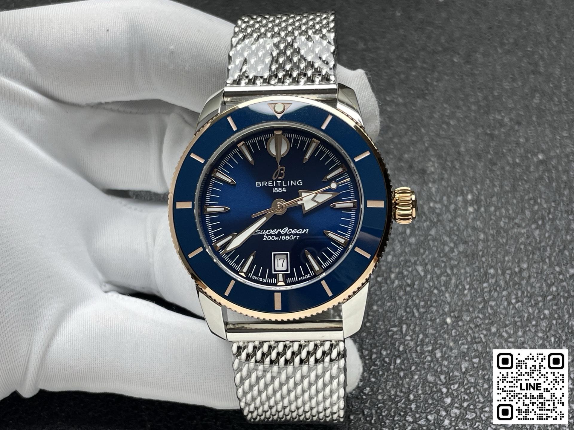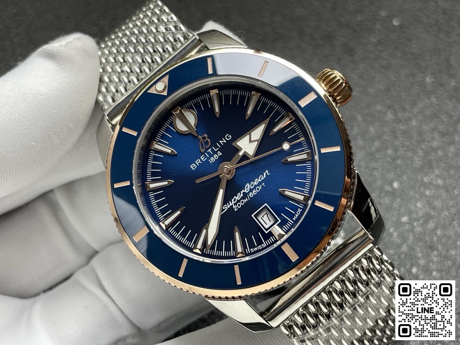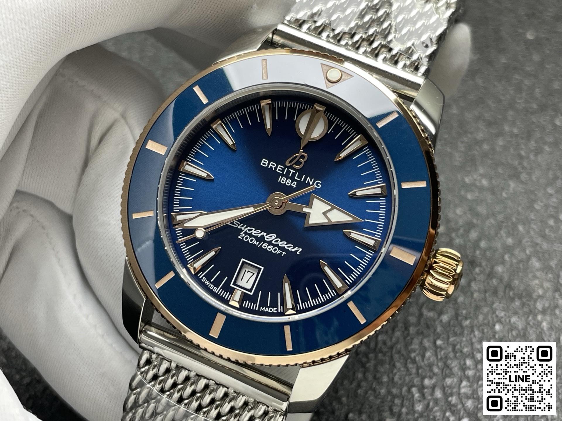 波間も、ウォーターフロントも、自在に駆ける。 スーパーオーシャン ヘリテージは、ただのダイバーズウォッチではありません。最初からそうでした。ブライトリングがこのモデルを初めて発表したのは1957年。当時の他のダイバーズウォッチとは一線を画すアプローチをとっていました。単に水中探検のためのツールではなく、スタイルも重視したデザインでした。特徴的な槍と矢の形をした針、アノダイズ処理を施した回転ベゼル、そして自然な美しさを備えた洗練されたプロポーションが、海とスタイルを愛する冒険家たちを魅了しました。その哲学は、スーパーオーシャン ヘリテージにしっかりと受け継がれてきました。1950年代の精神を宿しながら、今の時代に合わせて磨き上げられました。 セラミックインレイのベゼルは優れた耐傷性を提供し、一体型のメッシュメタルブレスレットはケースにぴったりとフィットし、折りたたみ式クラスプでしっかりと固定され、すっきりとした防水仕上げを実現します。6時位置に控えめな日付表示窓と、オリジナルのシグネチャー針(時間を示す矢印、分を示す槍)が、表面の上でも下でも、視認性とバランスを確保します。